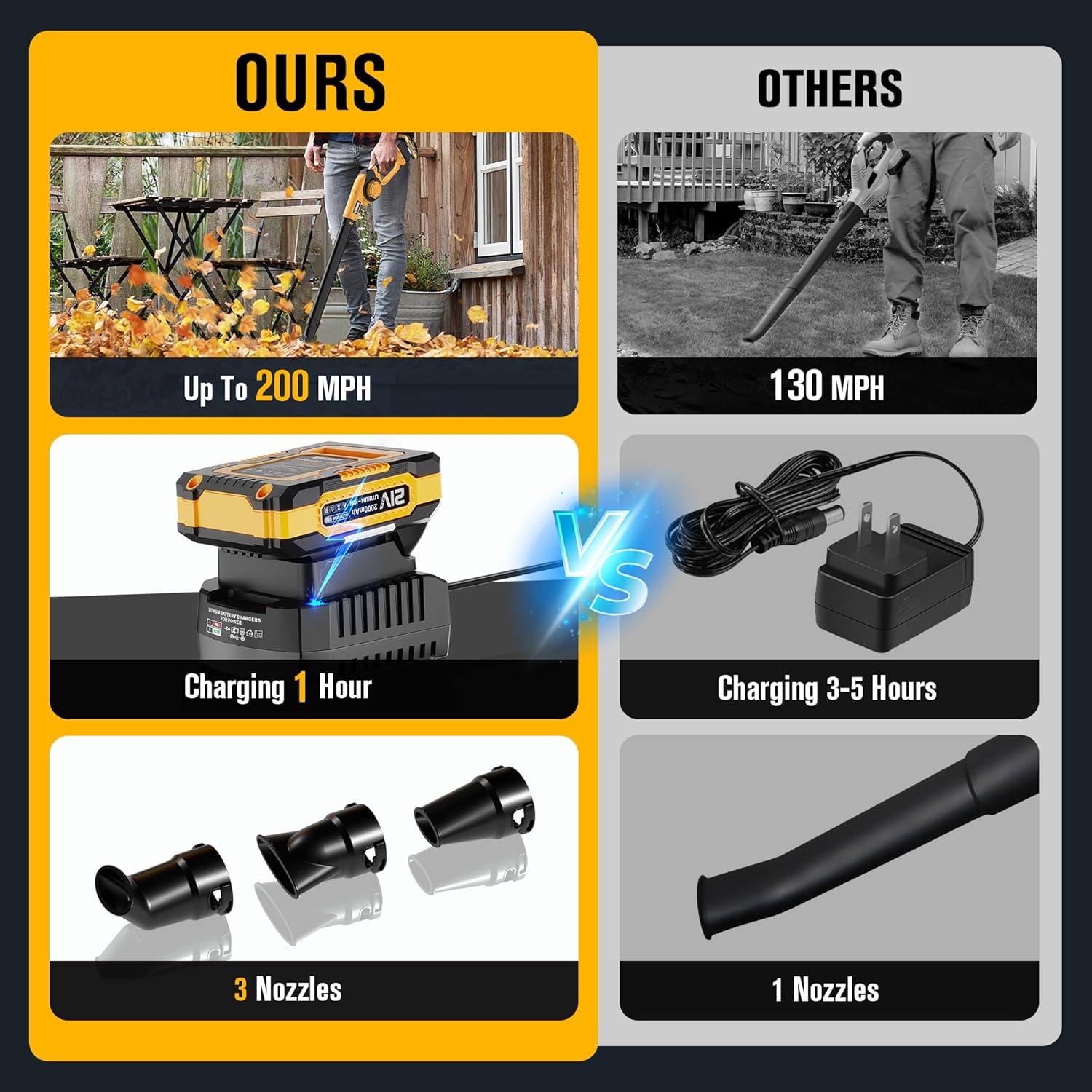 Équipé de deux batteries au lithium 2.0Ah et d'un chargeur rapide certifié UL, ce souffleur haute performance offre jusqu'à 60 minutes d'autonomie, selon la vitesse et les conditions. Que vous dégagiez des feuilles des allées ou de la poussière de votre établi, ce souffleur est conçu pour la polyvalence, la vitesse et la sécurité.